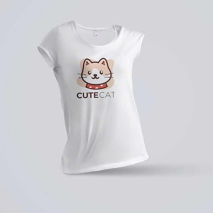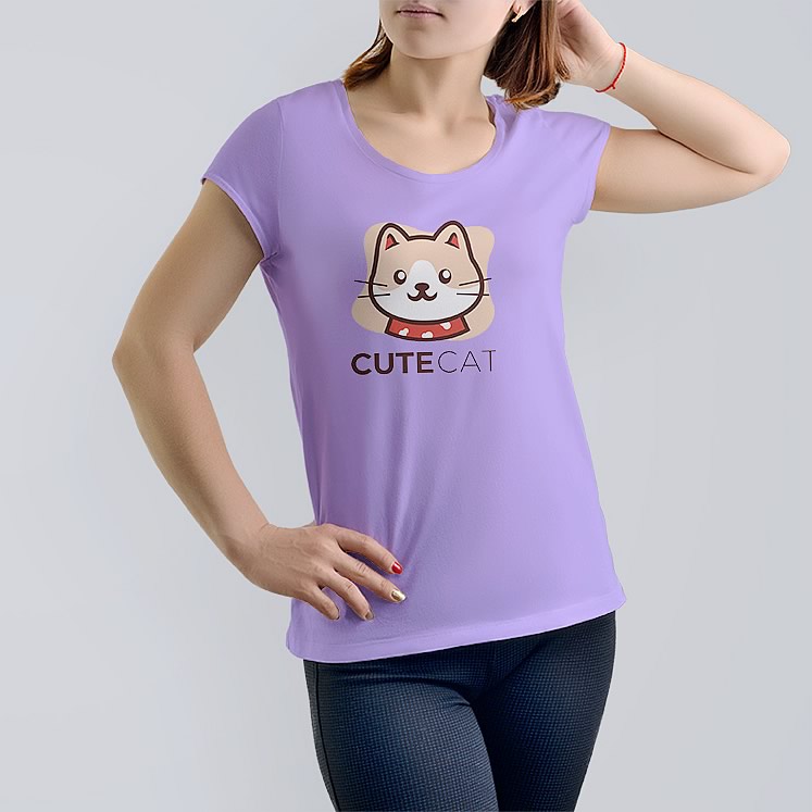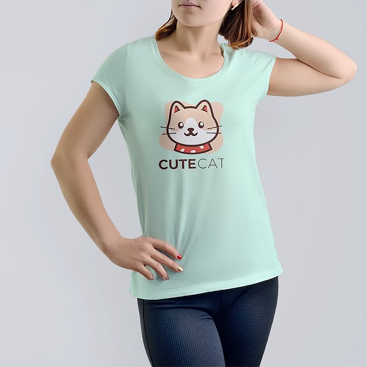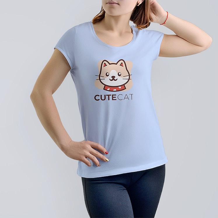 T-shirt Blusa Feminina Estampa Cut Cat – Tecido Viscolaycra em cor pastel. Manga Curta e Gola Larga e Redonda